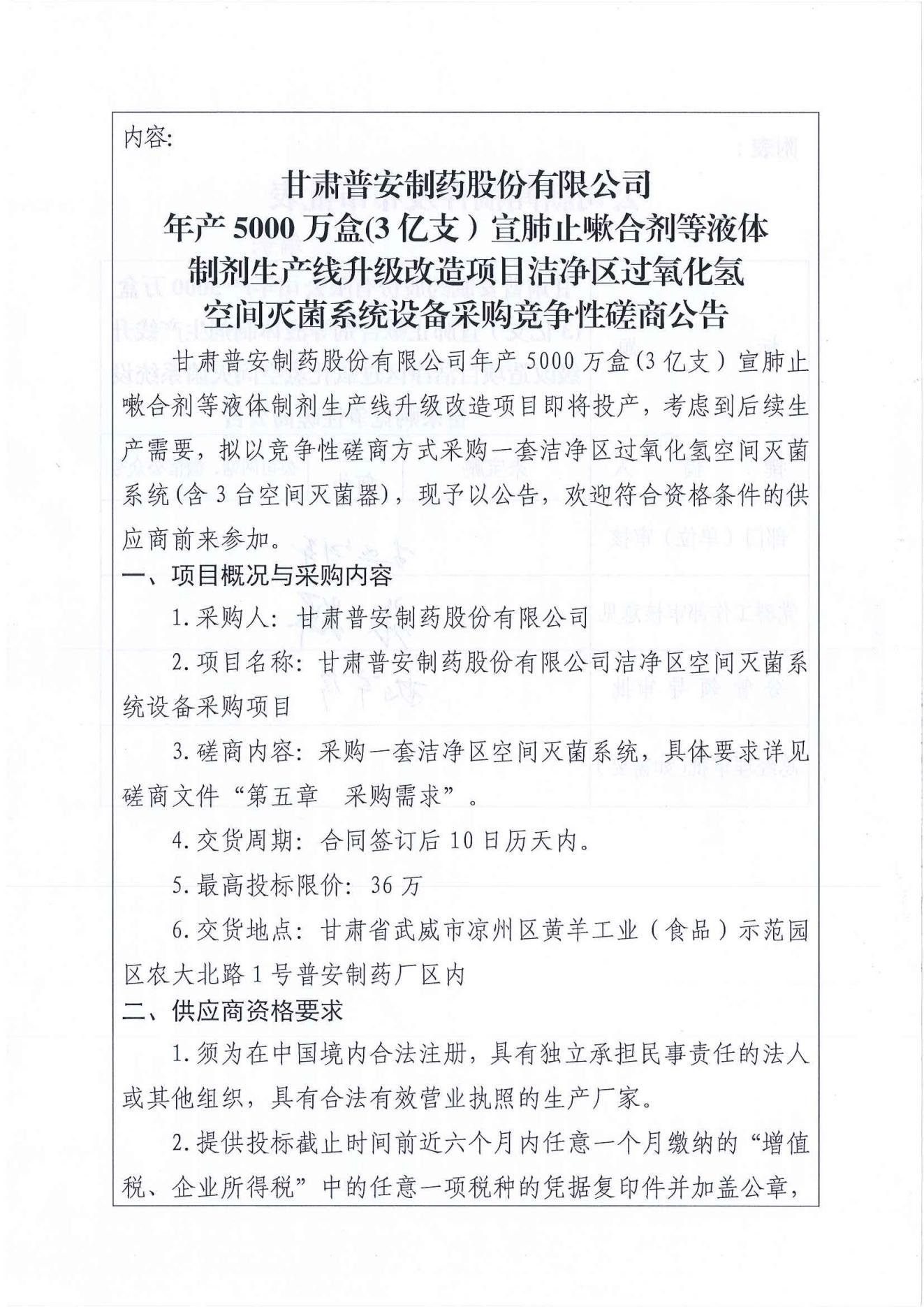 甘肅普安制藥股份有限公司年產5000 萬盒(3億支)宣肺止嗽合劑等液體制劑生產線升級改造項目潔凈區過氧化氫空間滅菌系統設備采購競爭性磋商公告