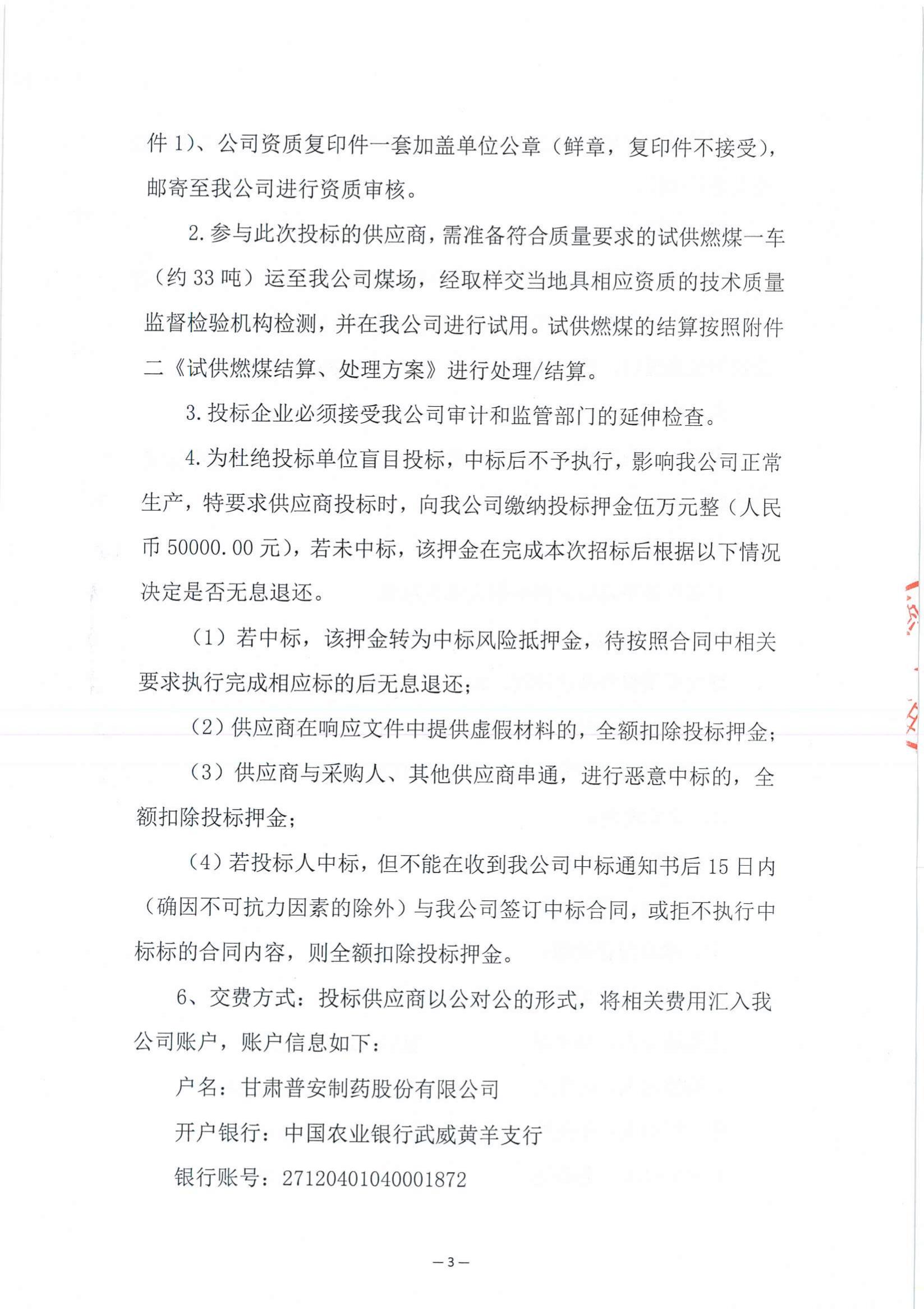 具體內(nèi)容詳見附件:甘肅普安制藥股份有限公司2023年4月燃煤采購競爭性磋商公告
