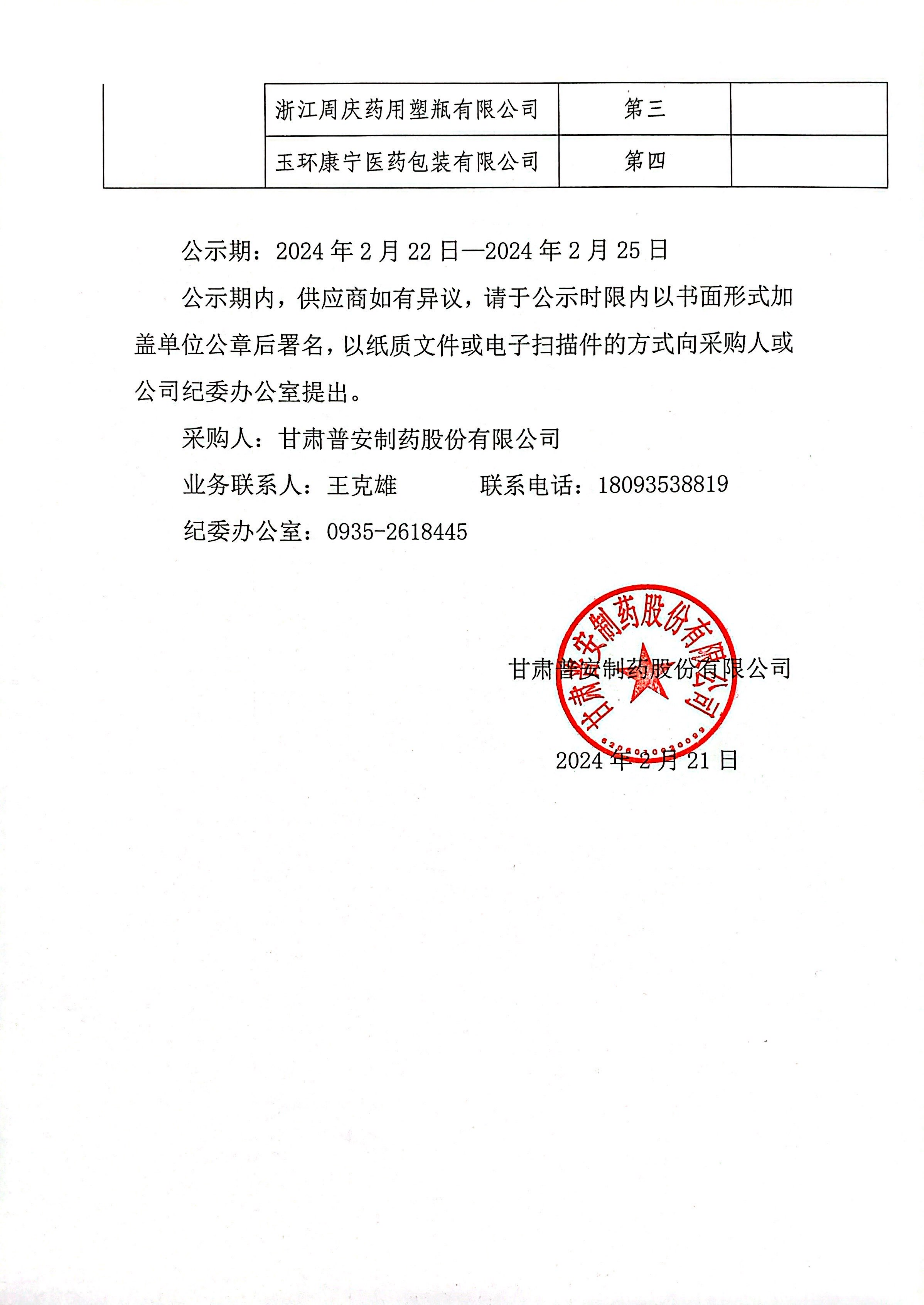 甘肅普安制藥股份有限公司2024年度宣肺止嗽合劑包裝材料(小盒、PET瓶)競爭性磋商采購結果公示