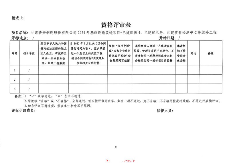 甘肅普安制藥股份有限公司2024年基礎設施改造項目-已建庫房4、已建配電房、已建質量檢測中心等維修工程招標公告
