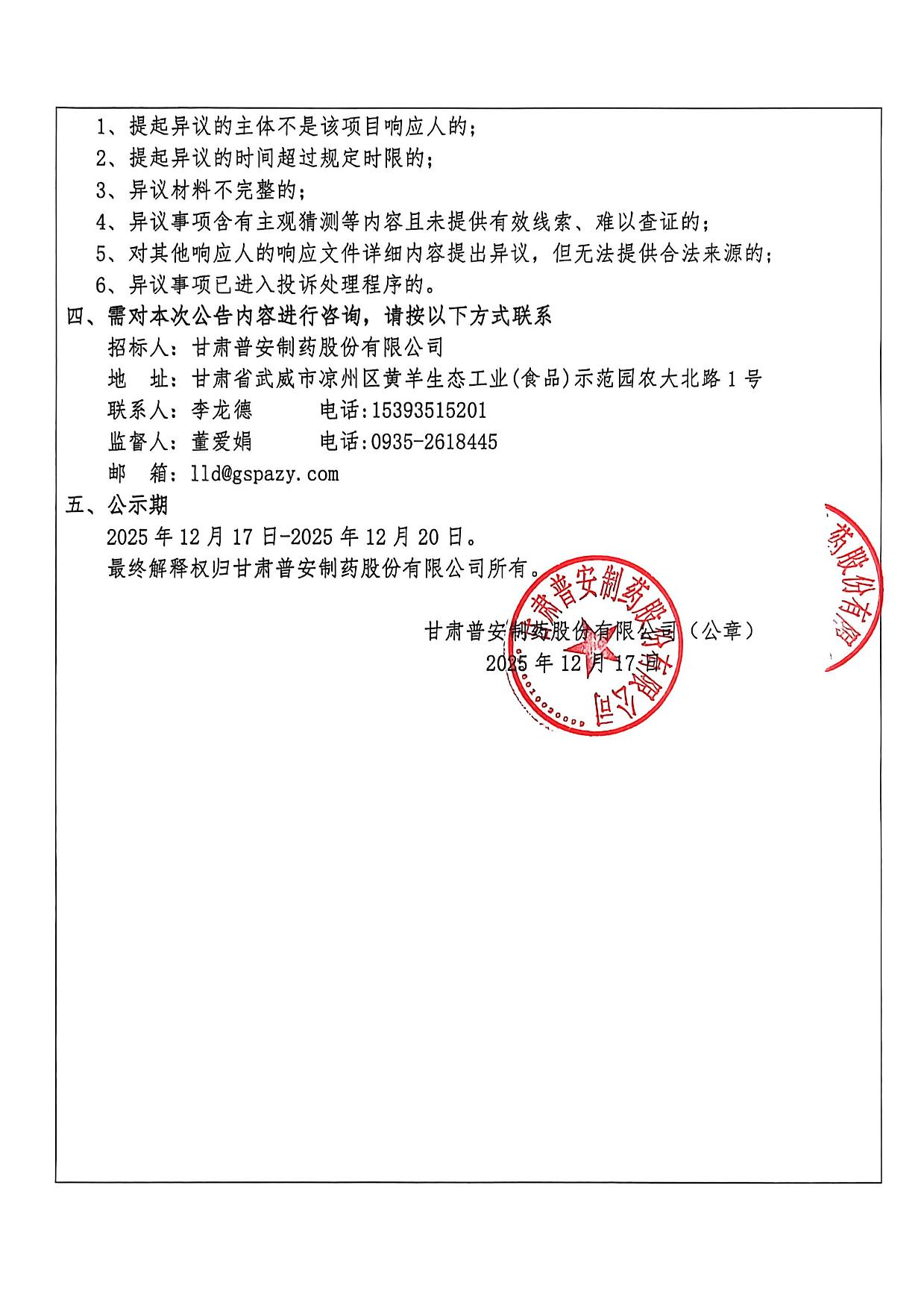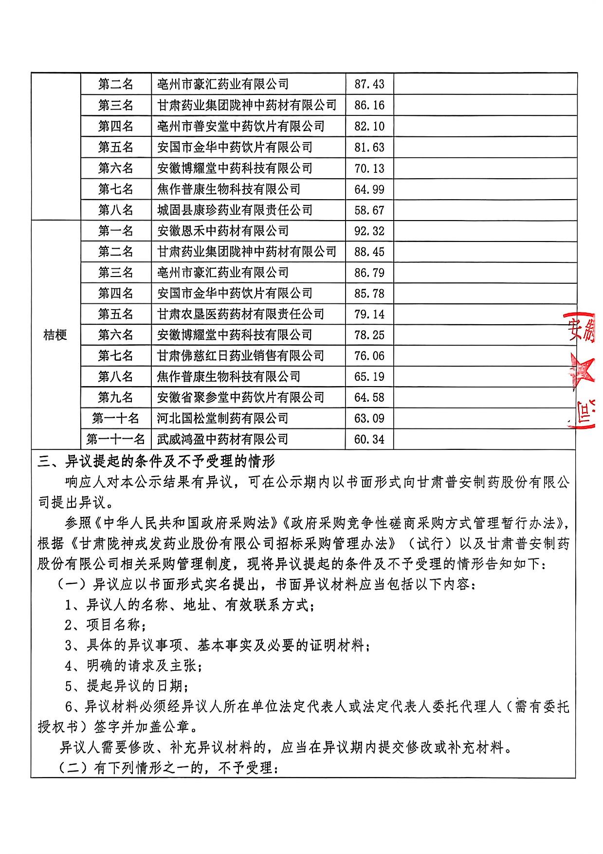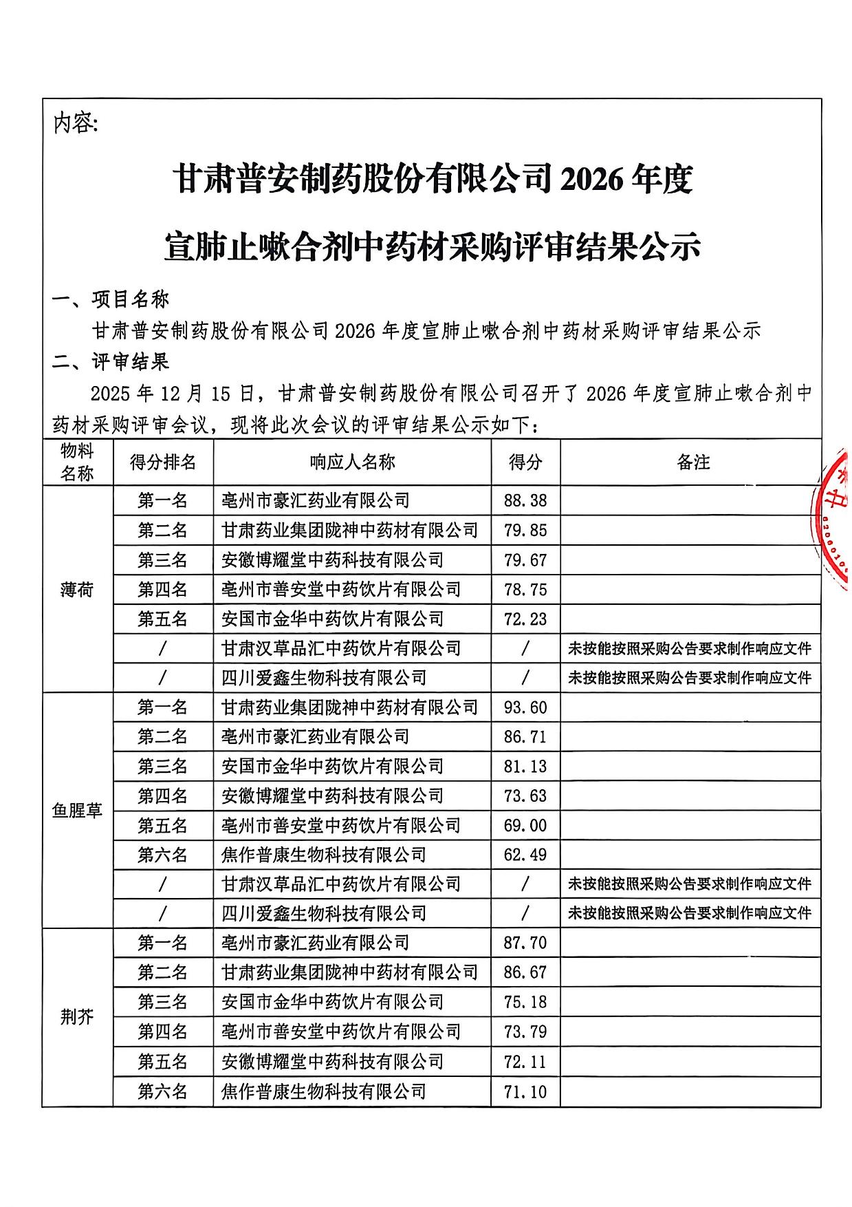 甘肅普安制藥股份有限公司2026年度宣肺止嗽合劑中藥材采購(gòu)評(píng)審結(jié)果公示