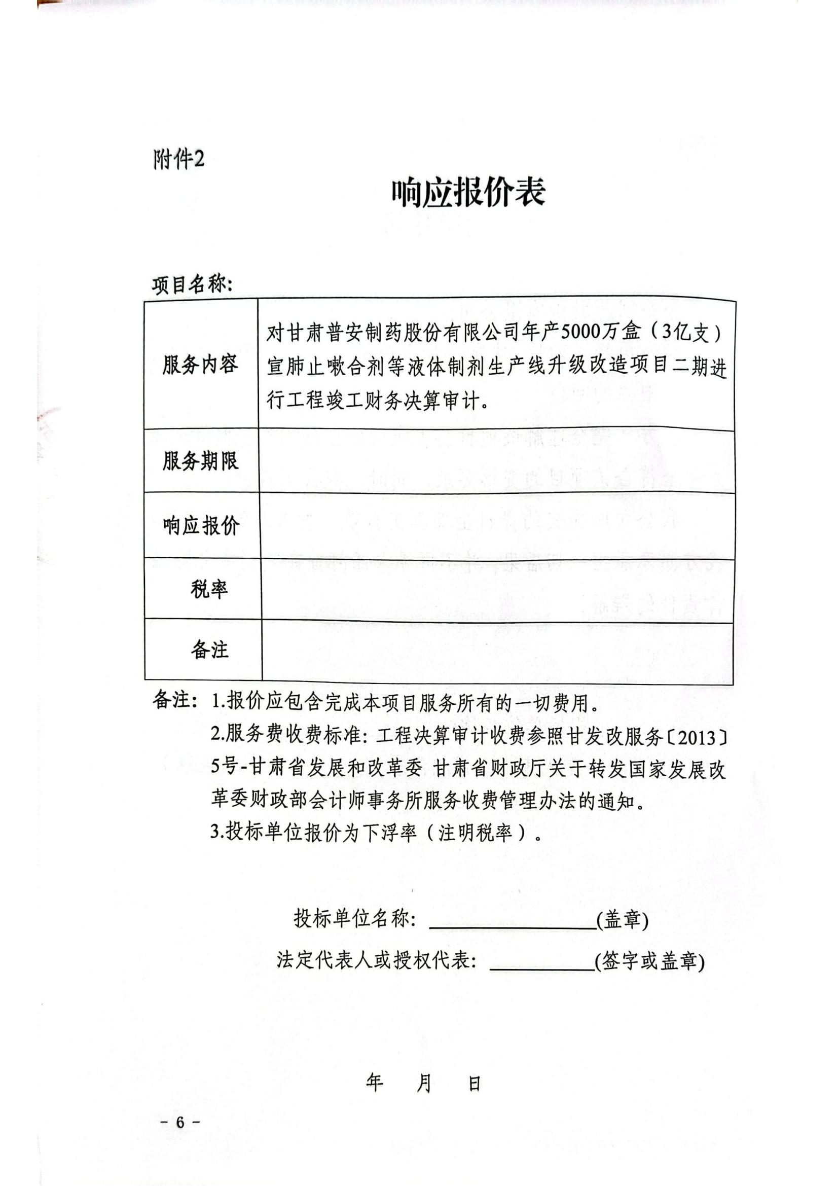甘肅普安制藥股份有限公司年產(chǎn)5000萬盒宣肺止嗽合劑等液體制劑生產(chǎn)線升級改造項目二期竣工決算審計服務(wù)招標公告
