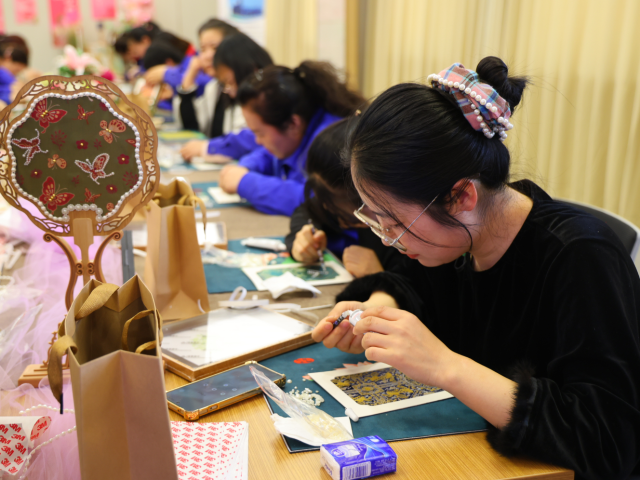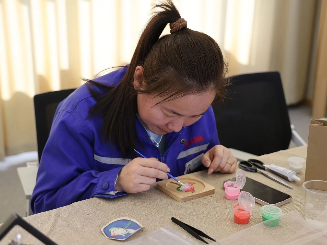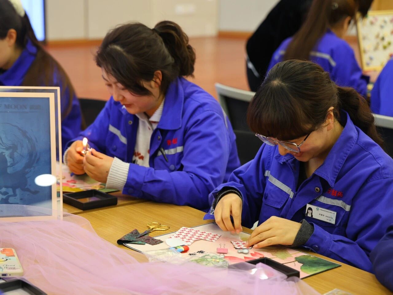 在手作體驗環節,大家熱情高漲、興致盎然,紛紛化身“手作匠人”,在老師的悉心指導下,運用掐絲琺瑯、宋錦、螺鈿等特色材料,精心創作飾品、裝飾畫、團扇、杯墊等文創作品。大家凝神專注、穿針引線、細心雕琢,將匠心與巧思融入指尖創作,在動手實踐中近距離感受傳統工藝的獨特魅力。現場氛圍溫馨和諧、歡聲笑語不斷,一件件精致美觀、獨具創意的手作作品陸續呈現,既展現了女職工心靈手巧、追求美好的精神風貌,也在互動交流中增進了情誼、舒緩了壓力。